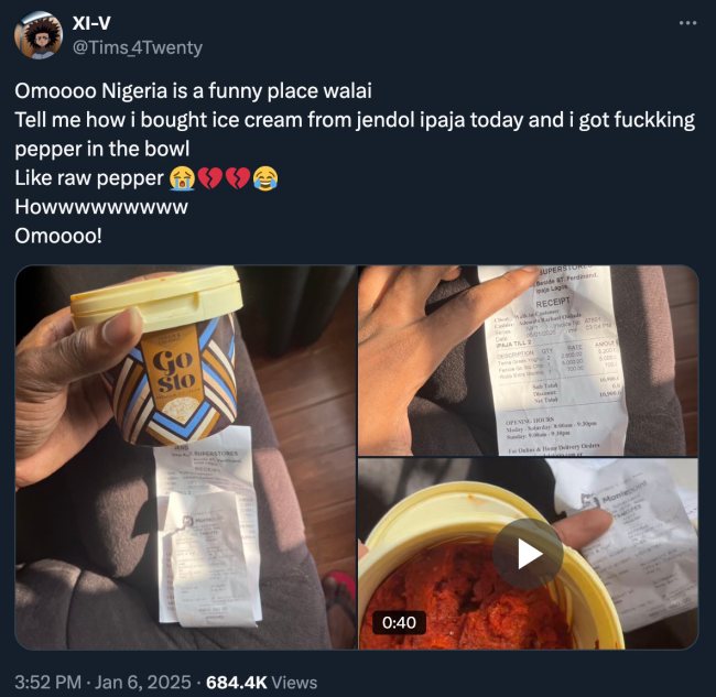 He revealed that he bought the product for a whopping ₦5000, only to find that the blended pepper in the plastic barely accounted for 20% of what should have been ice cream.