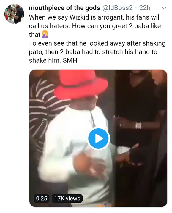 He wrote: “When we say Wizkid is arrogant, his fans will call us haters. How can you greet 2 baba like that