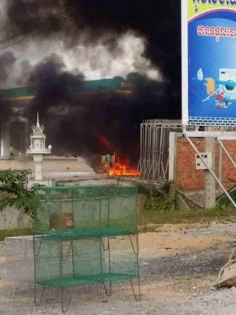 A Highlander car belonging to a Chinese man and a Cambodian man, exploded and completely burned at a Tela gas station in Kampong Speu, Cambodia on Monday, July 9.