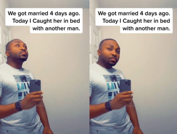 In a video shared on Tiktok, the man who looked quite sad wrote; ”We got married four days ago. Today I caught her in bedwith another man”