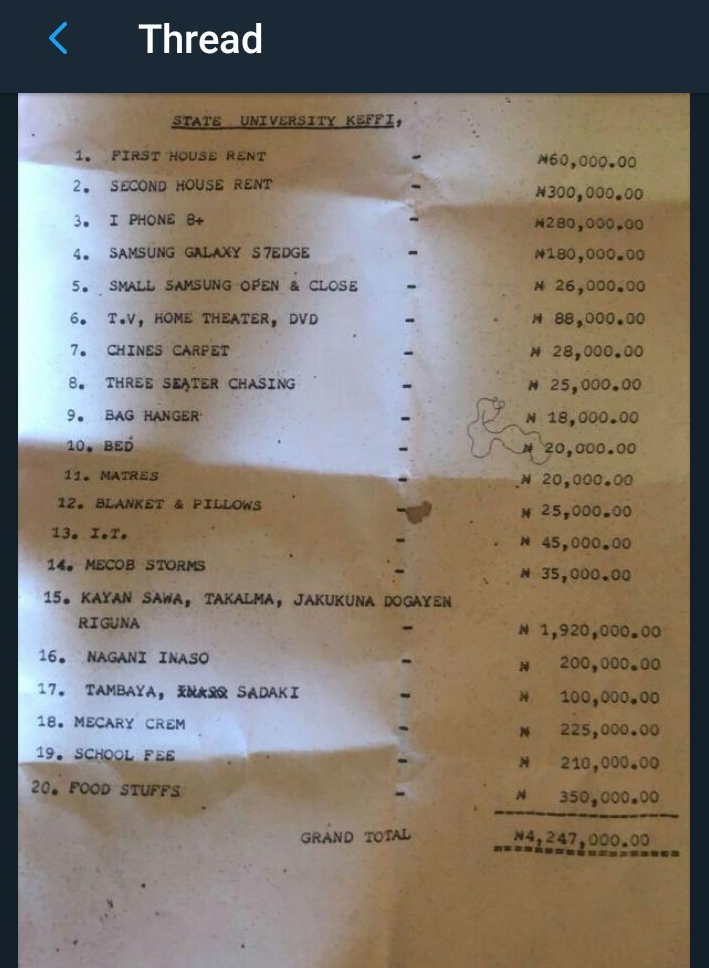 According to her the fiance demands full refund of all he has spent on her which amount to millions of naira