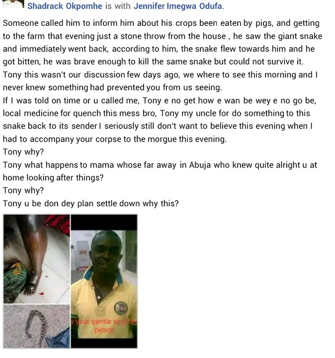 If I was told on time or u called me, Tony e no get how e wan be wey e no go be, local medicine for quench this mess bro, Tony my uncle for do something to this snake back to its sender I seriously still don’t want to believe this evening when I had to accompany your corpse to the morgue this evening.