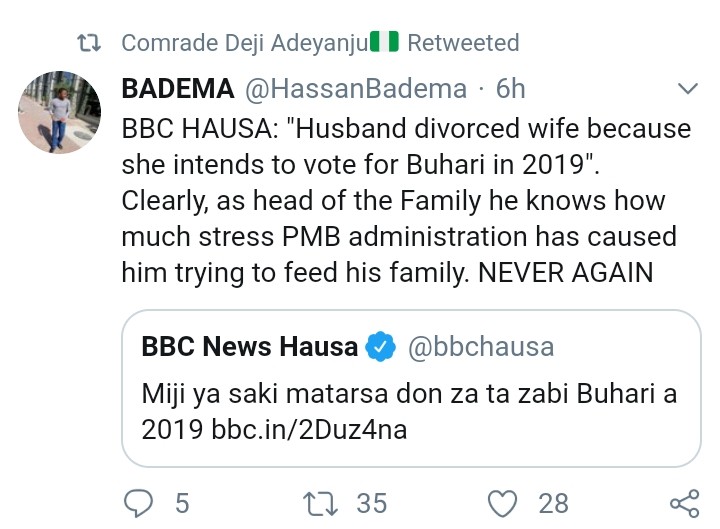 According to BBC HAUSA a man in Plateau state named Abdullahi Yadau has divorced his wife Hafsat Susaiman after a misunderstanding about 2019 Election.