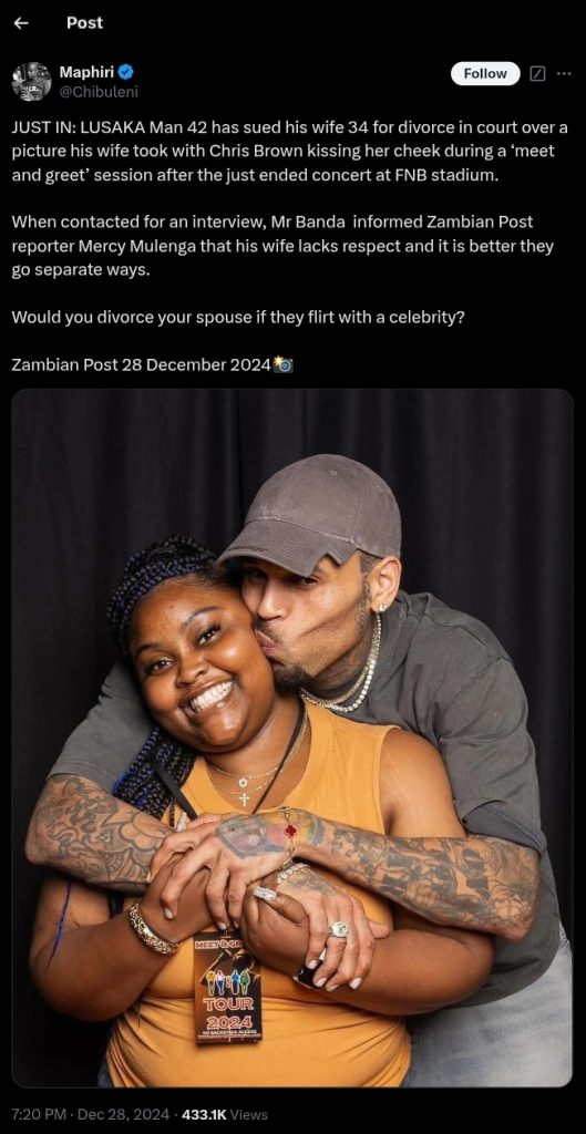 “LUSAKA man, 42, has sued his wife, 34, for divorce in court over a picture she took with Chris Brown kissing her cheek during a ‘meet and greet’ session after the just-ended concert at FNB Stadium.”