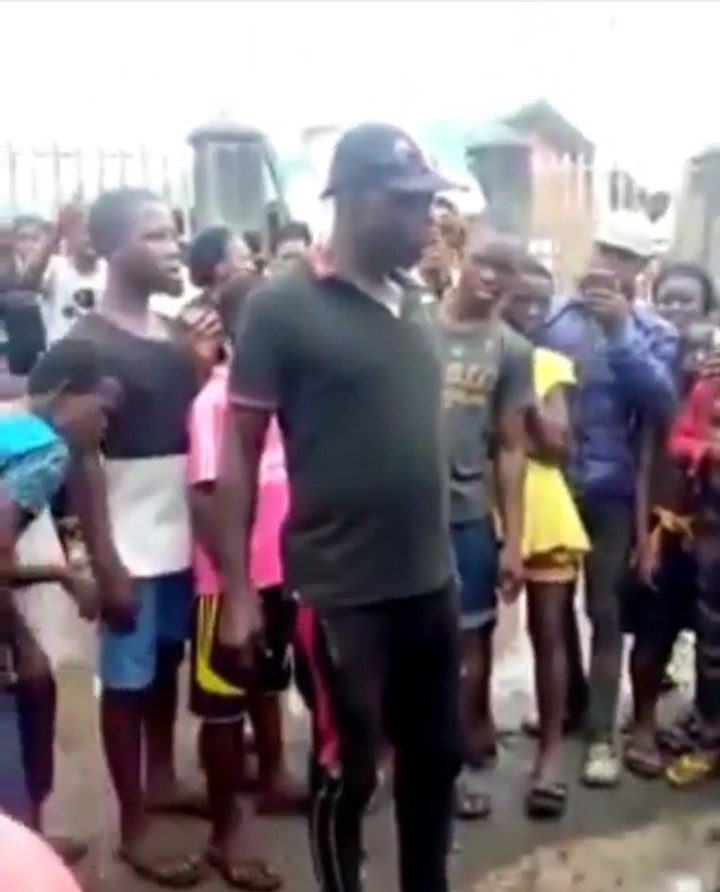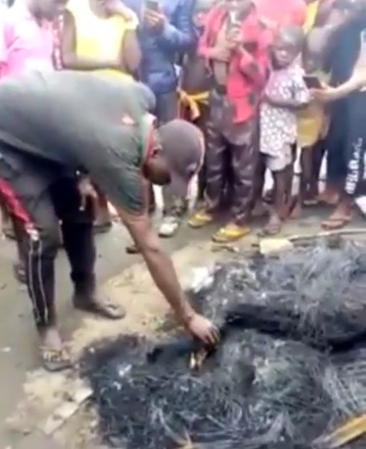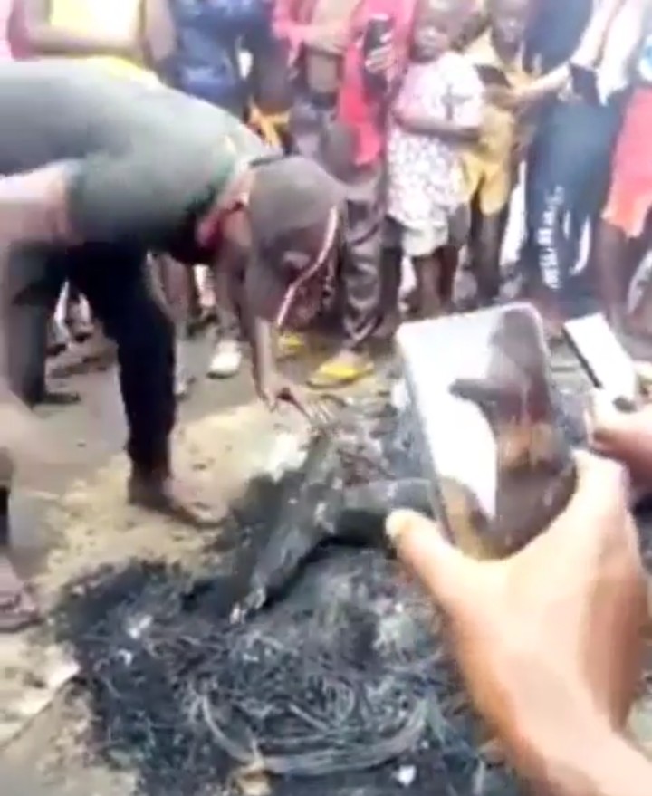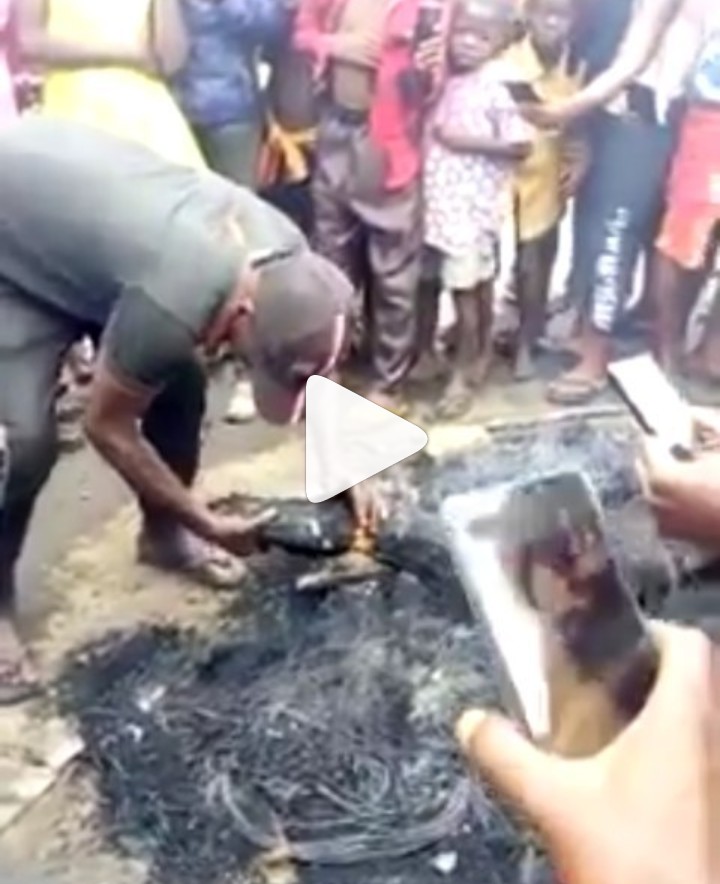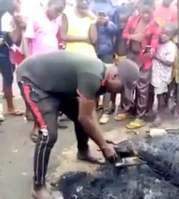 Here’s a moment a man was recorded on camera as he eats the burnt buddy of a suspected Criminal who have been burnt to death by the street thugs, the alleged Criminal is said to have been destroying their town for quite a while now, this happened in Delta State.