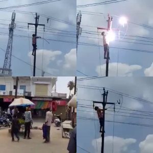 A video shared online captured the moment a man was electrocuted while trying to save a bird trapped on a high tension wire.