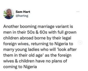 According to him, Nigerian men in their 50s and 60s who have lived most of their lives abroad are now returning home to marry younger women to start a new family.
