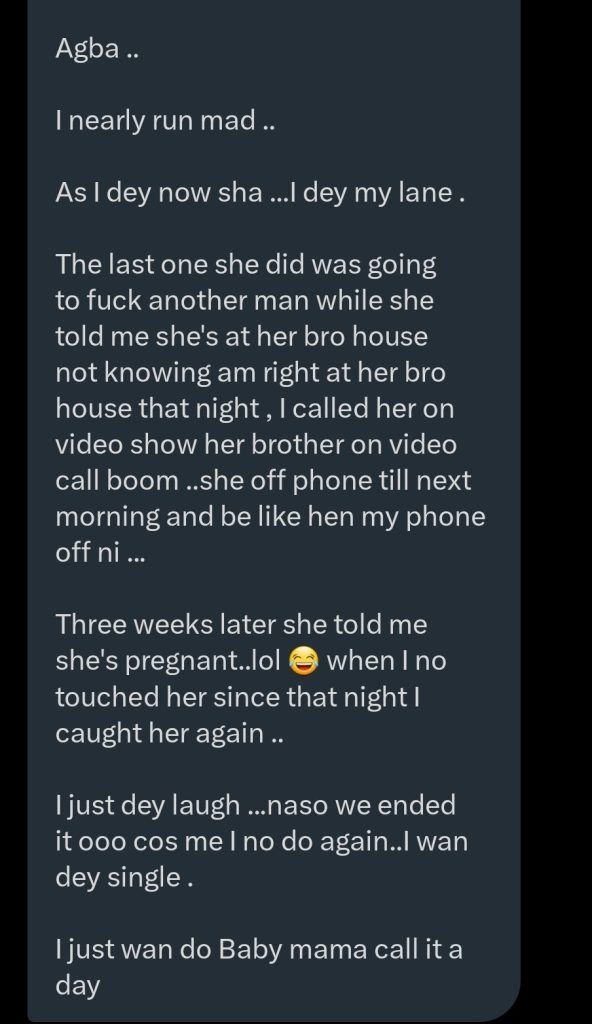 “Three weeks later, she told me she was pregnant. Agba, since that night I caught her, I hadn’t touched her! I just laughed and told myself, I’m done.”
