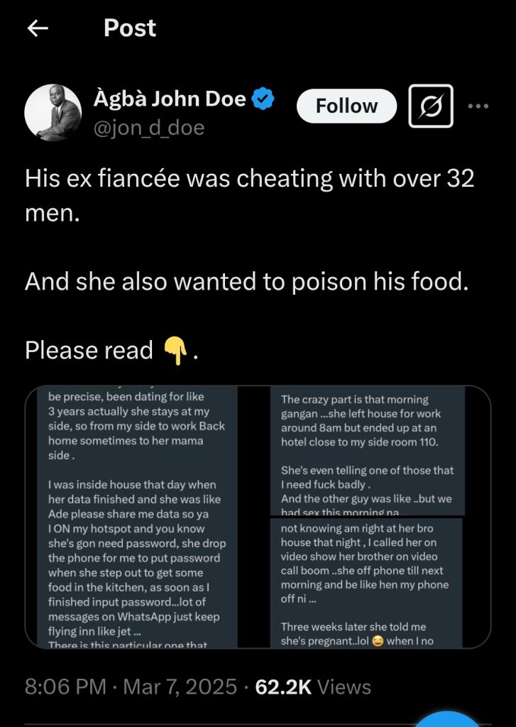A Nigerian man has taken to social media to share his heartbreaking experience after discovering that his fiancée had been intimate with 32 men while they were together.