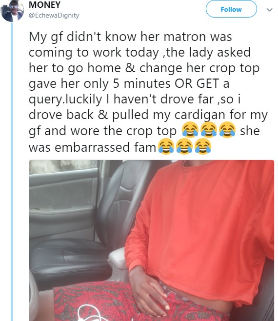 The young man with the Twitter handle @EchewaDignity said his girlfriend had on a crop top and her matron was going to penalize her for it, so he exchanged his cardigan with her crop top and had to drive off wearing the girly top.