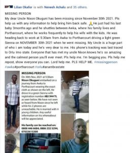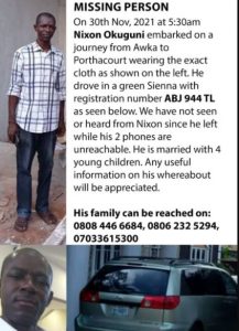 “He was heading back to work at 5:30am from Awka to Portharcourt driving a light green Sienna on NOVEMBER 30th 2021 when he went missing.