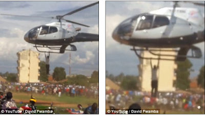In a bid to witness the public viewing of the corpse of Juma, the man hung to the helicopter causing harm to himself and potential danger to those onboard. The pilot’s attention was drawn to the event afer people noticed the man and began screaming and waving at the pilot.