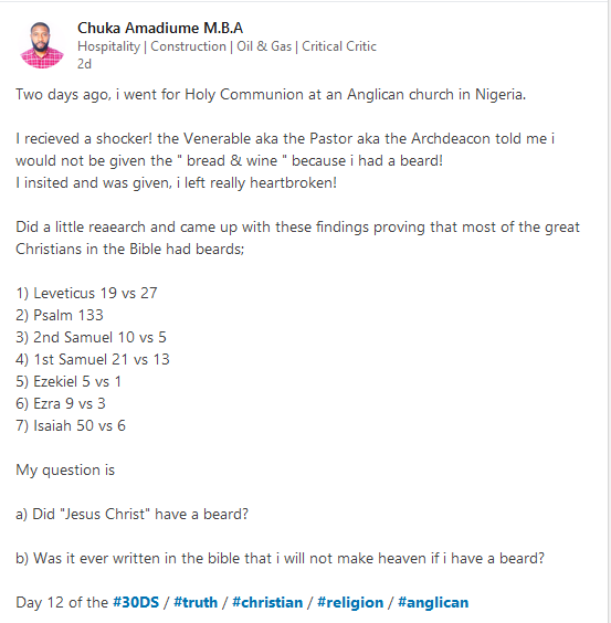 A Nigerian man has taken to social media to reveal his displeasure after being denied the Holy Communion because of his beard. According to the heartbroken man identified as Chuka Amadiume, this happened recently at an Anglican church despite his insistence.