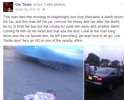 According to the Facebook user who narrated the sad story, a man who chased a commercial bus that bashed his car was knocked down and killed by another bus