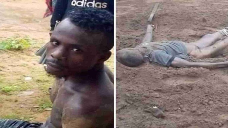 Suspect allegedly ran amok in a circumstances yet to be ascertained, attacked and killed his own biological father one Christopher Ogum ‘m’ aged 70years of same address with a shovel and buried him in a shallow grave. The suspect attempted to escape before he was apprehended and beaten to stupor by angry mob who equally forced him to exhume the corpse of his father from where he buried it.
