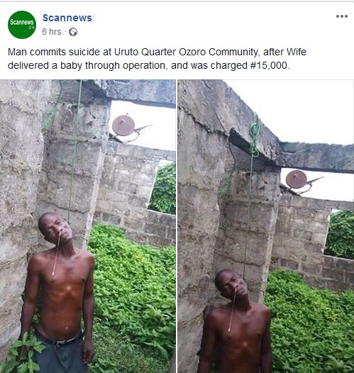 Residents were shocked after a man allegedly committed suicide in an uncompleted building in Ozoro community in Isoko North Local Government Area of Delta state. According to reports, the man killed himself by hanging after his wife delivered a baby through operation, and was charged N15,000.