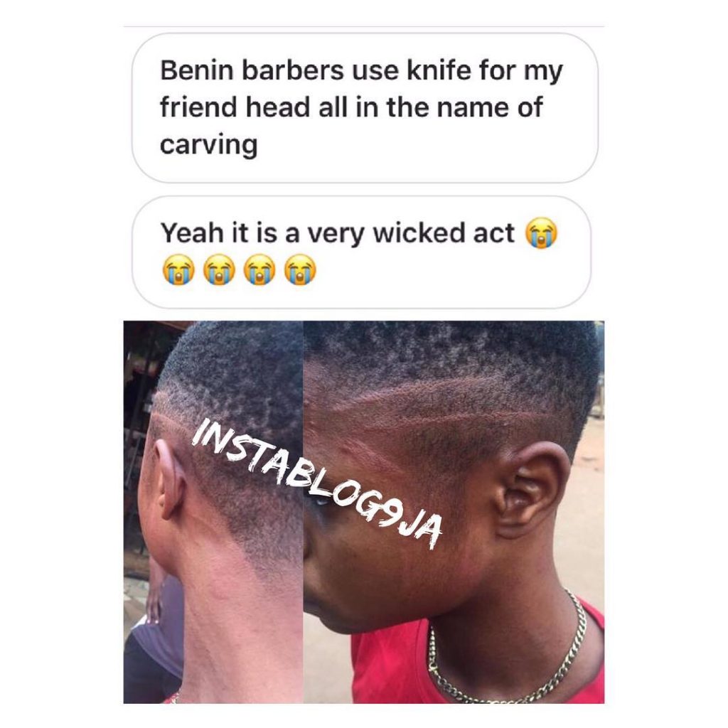 Man laments after a barber used knife to style his friend’s hair in Benin, Edo State.Benin people una dey vex oo