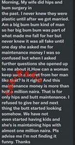 “Morning, My wife did hips and bum surgery in the past. I never knew they were plastic until after we got married. Am a big bum bum kind of man so her big bum bum was part of what made me fall for her but never knew it was all fake until one day she asked me for maintenance money I was so confused but when I asked further questions she opened up to me about it, How can a woman keep such a secret from her man like that? Is it right- And this maintenance money is more than half a million naira. That is for only hips and butt maintenance. I refused to give her and next thing the butt started looking somehow. We have not even started having kids and she’s is maintaining hips with almost one million naira. Pls advise me I’m not finding it funn . Thanks.”