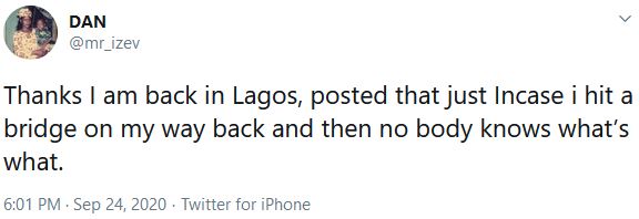 He wrote in a now-viral tweet: “I wanted to surprise my girlfriend of 4 years with a visit in Ibadan, I drove Lagos to Ibadan and found another guy in boxers hiding in her bathroom! she made me agree to celibacy 5 months ago! I am driving back to Lagos with a heavy heart.”