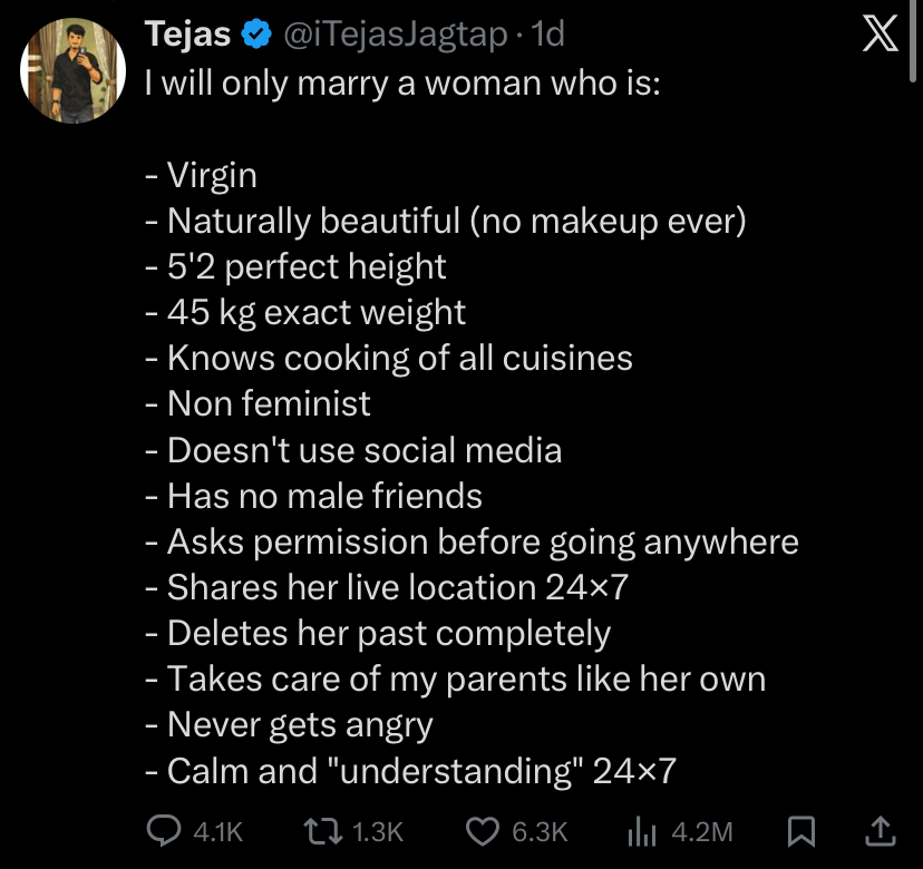 The X (formerly Twitter) user, identified as @iTejasJagtap, shared a detailed list of what he considers non-negotiable for a future wife.