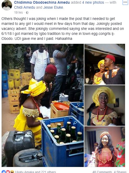 Writing after the wedding, Amedu said: “Others thought I was joking when I made the post that I needed to get married to any girl I would meet in few days from that day. Jokingly posted vacancy advert. She jokingly commented saying she was interested and on 6/1/18 I got married by Igbo tradition to my one in town egg. congrats. ij-Obodo. UDI gave me and I paid. Hahaahha.”