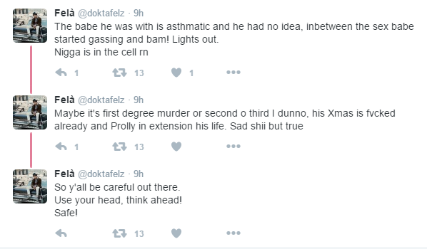 A twitter user, Fela, took to twitter to narrate how a guy is currently in police custody after a lady he randomly hooked up with, suddenly died while having sex with him due to asthma attack.