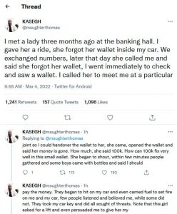 “A man identified as Thomas on Twitter took to the microblogging site to narrate how he was almost beaten to death after a lady he met at a bank hitched a ride in his car.