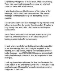I took my phone to scroll to see the time she forwarded the same picture to me after sending it to him. 45 minutes. I was an afterthought. My daughter’s middle name is a name he suggested in their chat,” he wrote.