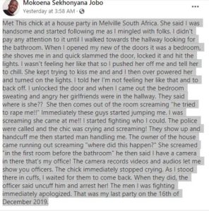 According to Mokoena Sekhonyana Jobo, the incident occurred at a house party in Melville South Africa, and involved a lady who complimented his looks and “began following him while he mingled with folks” at the party.