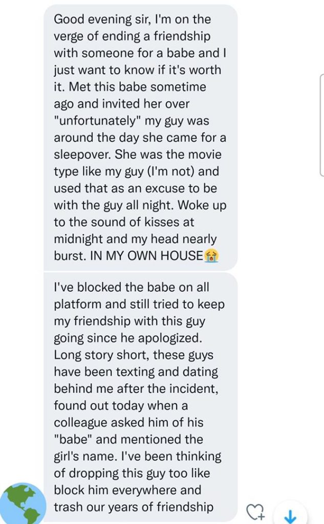 She was the movie type like my guy (I’m not) and used that as an excuse to be with the guy all night. Woke up to the sound of kisses at midnight and my head nearly burst. IN MY OWN HOUSEI’ve blocked the babe on all platform and still tried to keep my friendship with this guy going since he apologized.Long story short, these guys have been texting and dating behind me after the incident, found out today when a colleague asked him of his “babe” and mentioned the girl’s name. I’ve been thinking of dropping this guy too like block him everywhere and trash our years friendship.”