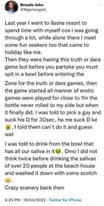 “A man took to social media to narrate his unpleasant experience during a vacation at a resort in Ilashe where he engaged in a truth or dare game with complete strangers.