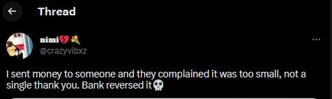 “I sent money to someone, and they complained it was too small, not a single thank you. Bank reversed it💀 Is God not good bayi.”