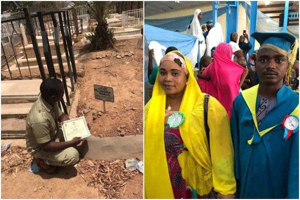The man identified as Isah Salisu Alhassan, a graduate of Kano State Polytechnic, and recently passed out from the one year mandatory National Youth Service Corps (NYSC), shared emotional photos of him presenting his discharge certificate to his late mum at her grave.