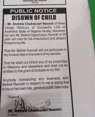 According to a public notice, a man disowned his own son for allegedly threatening to kill him. He further added that, upon death, the said son will not participate in his funeral rites nor inherit any of his properties