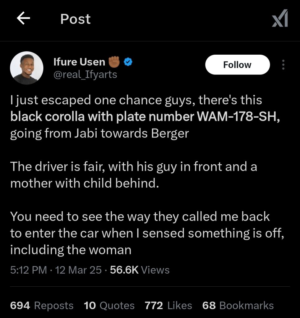 “I just escaped from ‘one chance’ guys. There’s a black Corolla with plate number WAM-178-SH, heading from Jabi towards Berger,” he wrote.