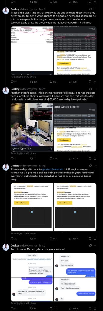 “These are deposits done to @askmichaeludoh’s Infinox. I remember Michael would give me a call every single weekend, asking how family and everything was. But when his boy did what he had to do, of course, he turned away.”