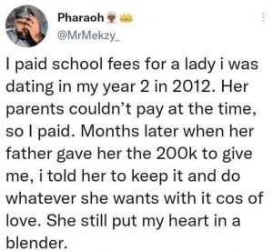 “I paid school fees for a lady i was dating in my year 2 in 2012. Her parents couldn’t pay at the time, so I paid. Months later when her father gave her the 200k to give me, i told her to keep it and do whatever she wants with it cos of love. She still put my heart in a blender.