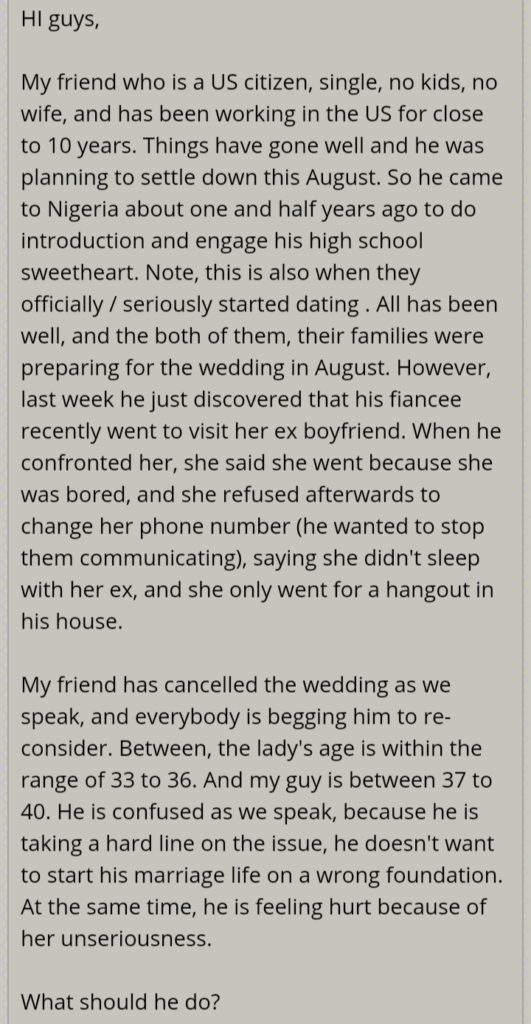 The Nairaland user wrote, ”My friend has cancelled the wedding as we speak, and everybody is begging him to re-consider. Between, the lady’s age is within the range of 33 to 36. And my guy is between 37 to 40. He is confused as we speak, because he is taking a hard line on the issue, he doesn’t want to start his marriage life on a wrong foundation. At the same time, he is feeling hurt because of her unseriousness.”