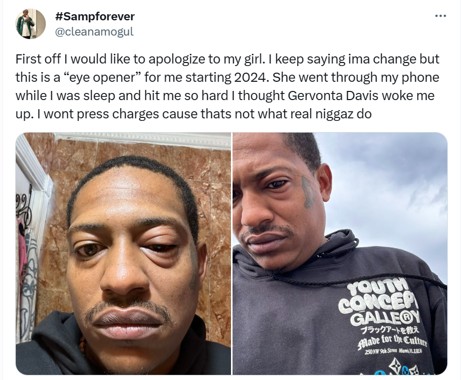 “First off I would like to apologize to my girl. I keep saying ima change but this is a “eye opener” for me starting 2024. She went through my phone while I was sleep and hit me so hard I thought Gervonta Davis woke me up. I wont press charges cause thats not what real niggaz do”