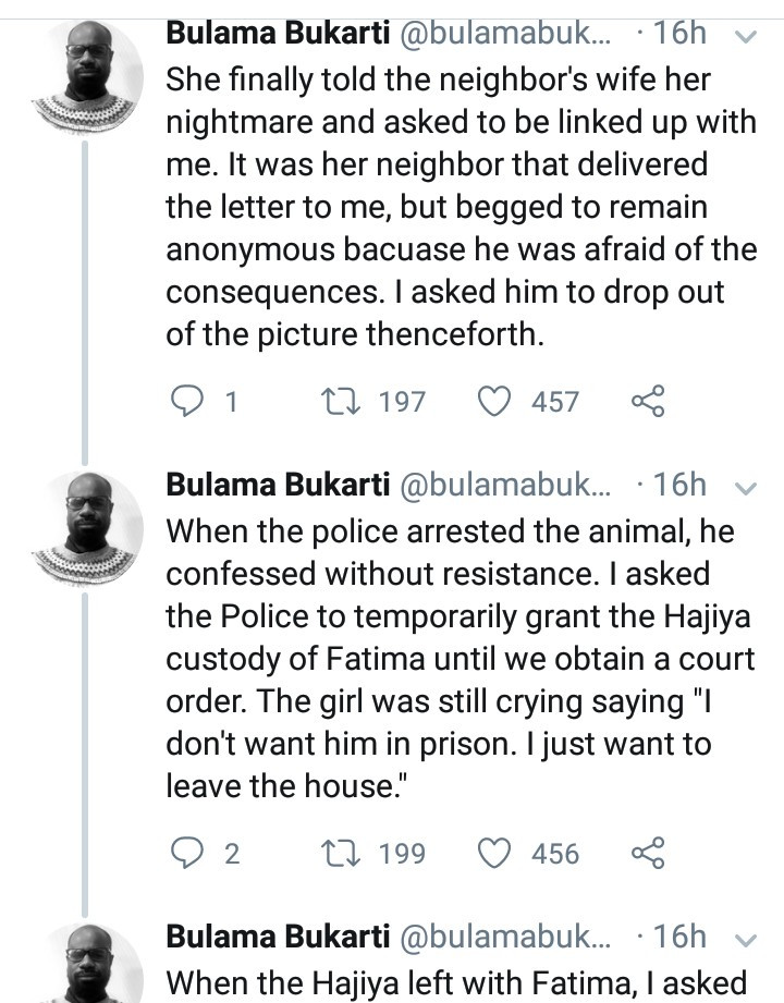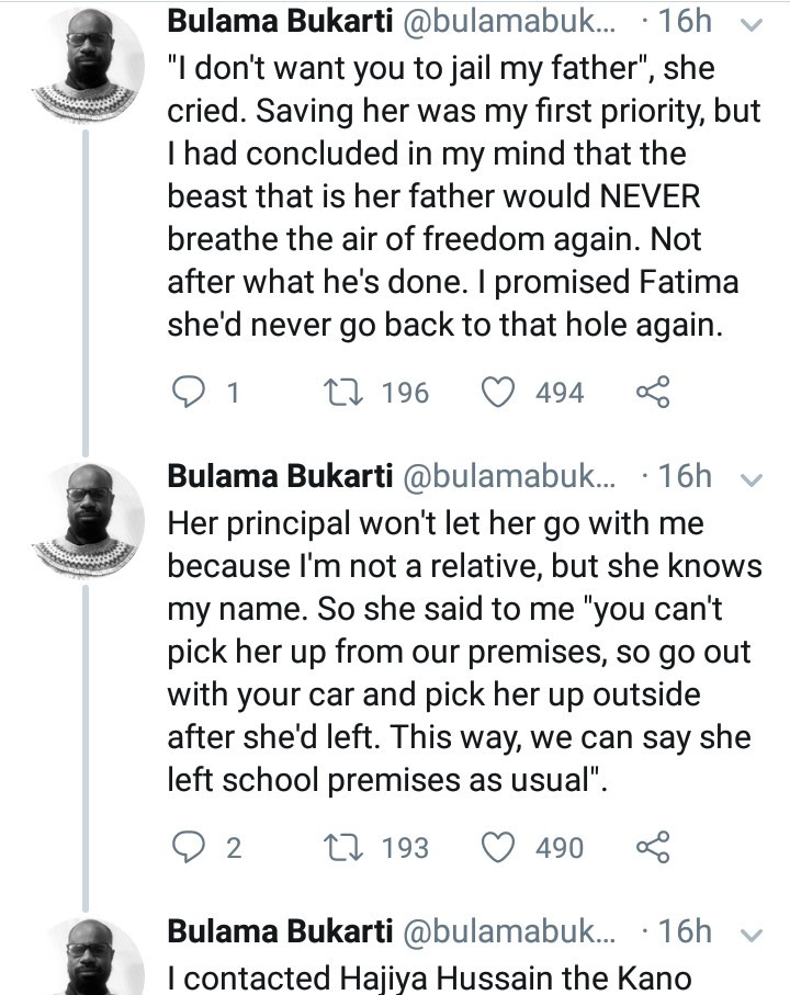 Bakarti wrote: “I contacted Hajiya Hussain the Kano State Chair of FIDA. She wasn’t in town so she linked me up with another Hajiya who kindly offered to help us and accommodate the victim. I reported to the Police Area Command at Bank Road Kano (former MTD), who immediately swung into action.”