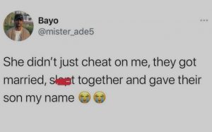 He wrote, “She didn’t just cheat on me; they got married, slept together, and gave their son my name.”