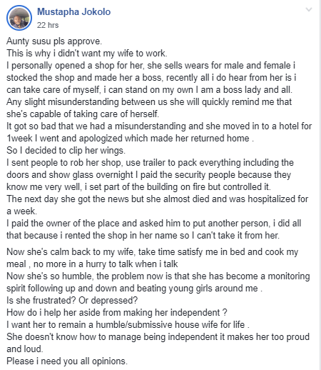 A man took to a Facebook group to reveal how far he went to clip his independent wife’s wings and make her submissive to him, IgbereTv news report.