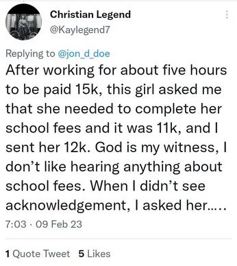 “After working for about five hours to be paid 15k, this girl asked me that she needed to complete her school fees and it was 11k, and I sent her 12k. God is my witness, I don’t like hearing anything about school fees. When I didn’t see acknowledgement, I asked her…..