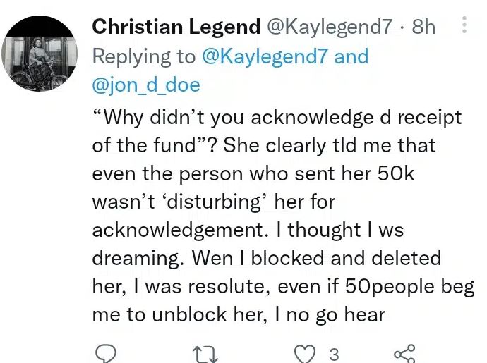 “Why didn’t you acknowledge d receipt of the fund”? She clearly tld me that even the person who sent her 50k wasn’t ‘disturbing’ her for acknowledgement. I thought I ws dreaming. Wen I blocked and deleted her, I was resolute, even if 50people beg me to unblock her, I no go hear”