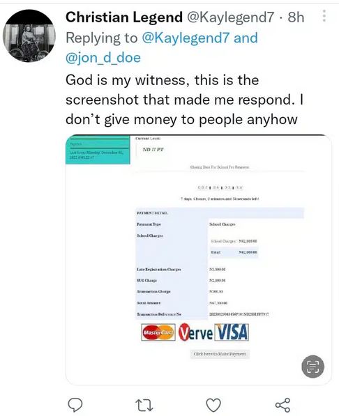 The man who goes by the handle @Kaylegend7 on Twitter said that a lady had asked him to help complete her fees that remained 11,000 naira.
