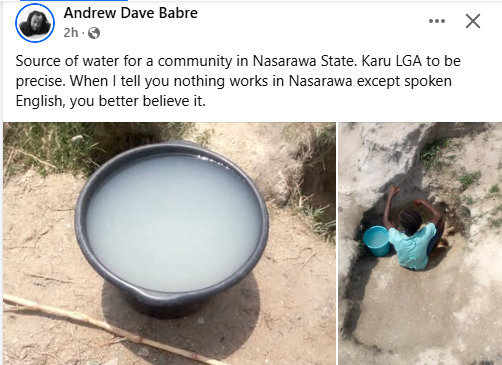 A Facebook user, Andrew Dave Babre, from Nasarawa State, has decried the lack of access to clean water in a community in his state.