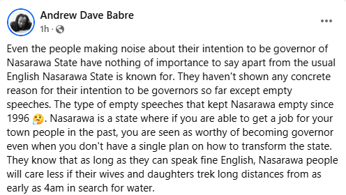“Even the people making noise about their intention to be governor of Nasarawa State have nothing of importance to say apart from the usual English Nasarawa State is known for.