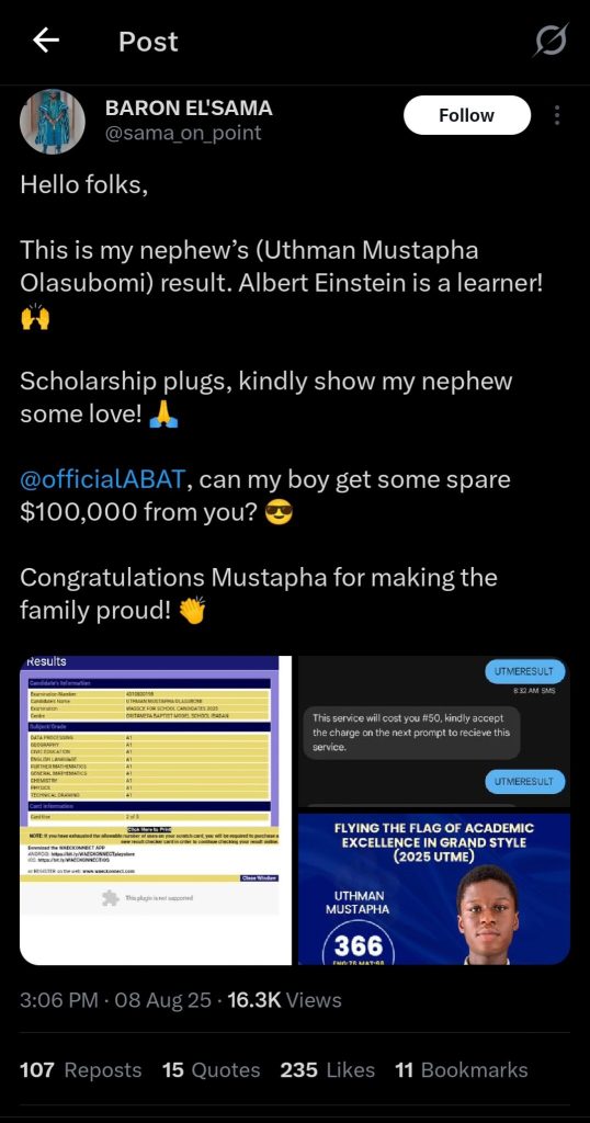The appeal was made in a post on X (formerly Twitter) by user @sama_on_point, who shared a snapshot of the results while praising his nephew.