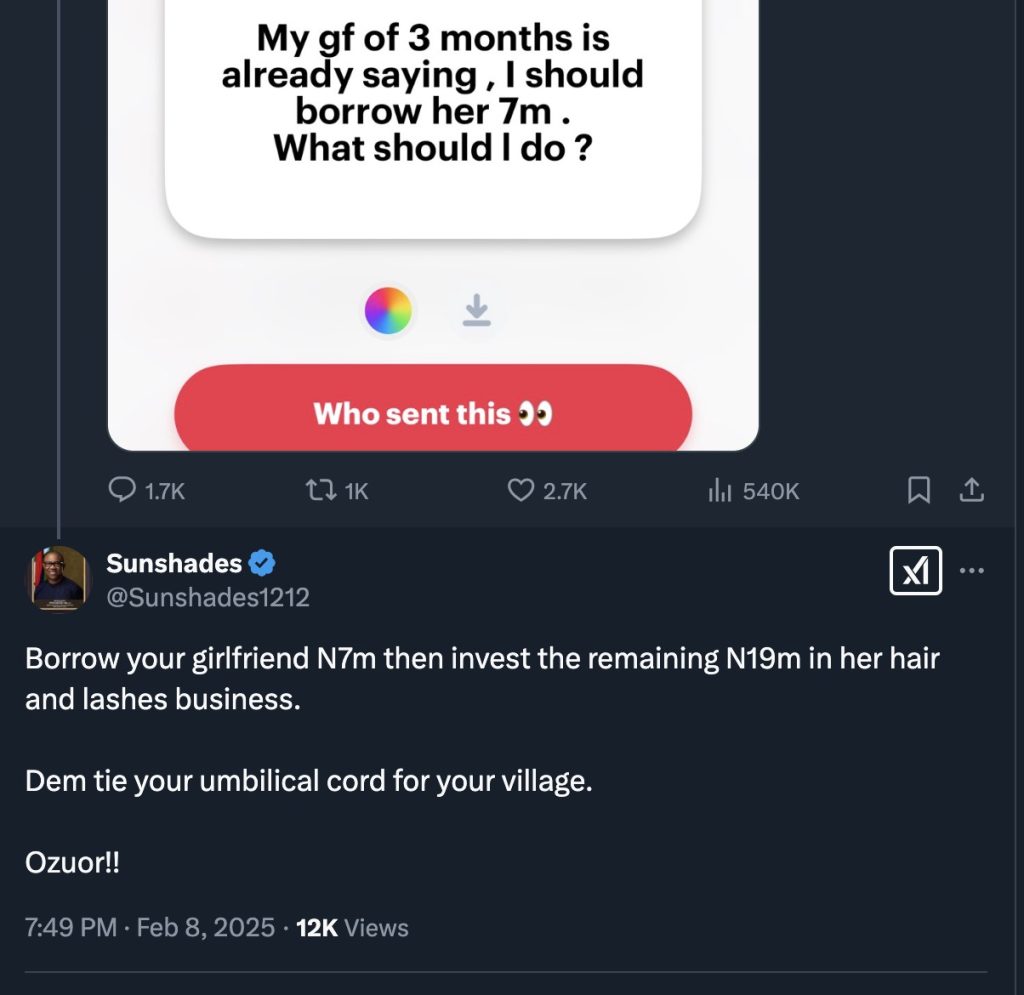 Another user @Sunshades1212 added, “Borrow your girlfriend N7m then invest the remaining N19m in her hair and lashes business. Dem tie your umbilical cord for your village. Ozuor!!”