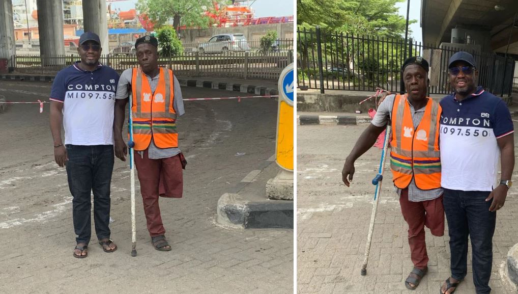 Adeyemi was moved to help the man when he spotted him controlling traffic in Lagos effectively despite having one leg.
